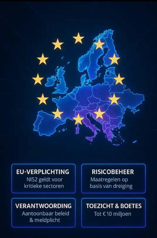 Wij analyseren waar uw organisatie momenteel staat op het gebied van NIS2-compliance en geven gericht inzicht in de verbeterpunten. U ontvangt een helder rapport met concrete prioriteiten en vervolgstappen.
